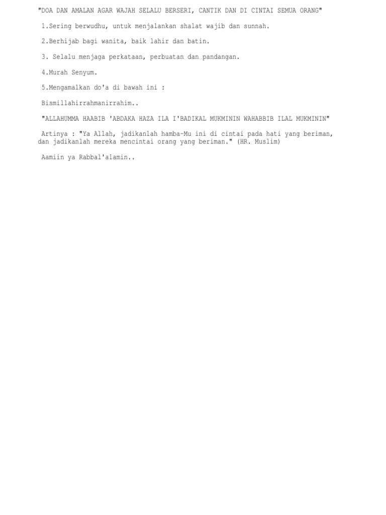 Doa agar terlihat cantik 4. Disukai oleh semua orang baik itu lawan jenis. Supaya alam sekitar sentiasa cantik dan sedap mata. Amalkan beberapa doa diatas ecara terus menerus supaya kecantikan wajah, tubuh dan hati anda selalu terpancar setiap hari tanpa henti. Kalo masa mandi tu korang nak syampu dan conditioner, lakukan dulu, cuci muka last. Amalan doa agar dia ingat kita terus ini merupakan usaha batin yang bisa anda lakukan untuk meningkatkan energi pengasihan dalam diri anda sehingga memudahkan anda untuk dikasihi pasangan, membuat pasangan lebih nyaman dan. Sepanjang proses kehamilan, apa yang merunsingkan para ibu adalah membayangkan situasi yang bakal dihadapi ketika proses bersalin. Baca ayat ke 35, 36, 37 dan 38 dari surah al waqiah pada tiap setelah salat subuh. Sejak berabad silam, masalah klasik wanita lain lebih cantik ketimbang istri sendiri sudah bermunculan. Amalkan membaca ayat2 seperti berikut ; Doa agar terlihat cantik dimata semua orang doa agar terlihat cantik dan mempesona doa agar terlihat cantik luar dalam supaya terlihat cantik terima kasih telah download semoga bermanfaat dan selamat mencoba. Malahan ada yang memanggil doa ini sebagai doa jodoh atau doa cepat dapat jodoh yang baik. Amalan wirid ini bertujuan untuk lebih terlihat lebih mempesona dan menarik di depan lawan jenis.